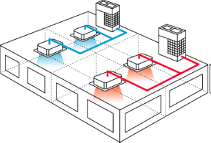 Multiple cassettes in a VRF system can provide either heating or cooling from one condensing unit. In the example below, half of the building is cooled, and the other half of the building is heated simultaneously by two condensers.